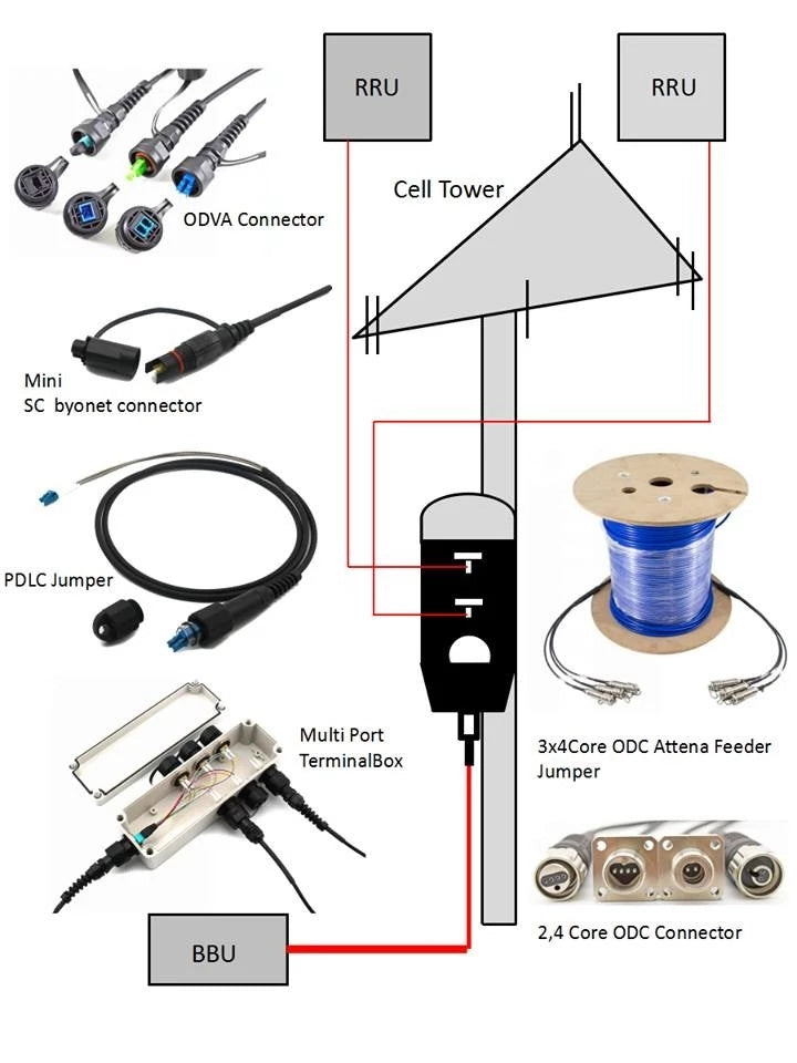 ODVA PDLC BBU/RRU Patch cables, together with IP-67 rated compact RRH/RRU Helix cover connectors that have fast coupling. these patch cables are always sealed with rugged fiber terminal junction boxes that meet the requirements of more antennas on a wireless tower.